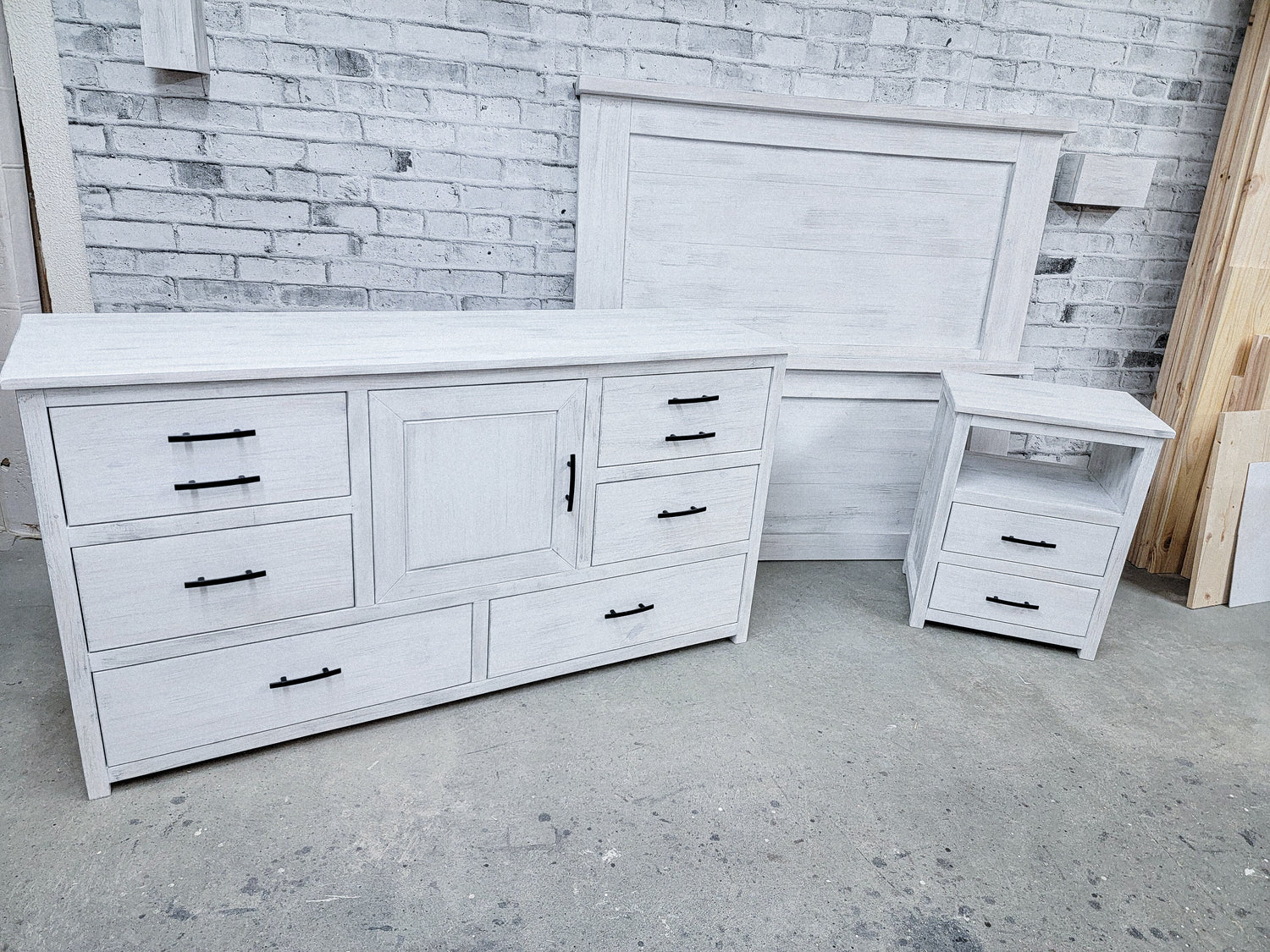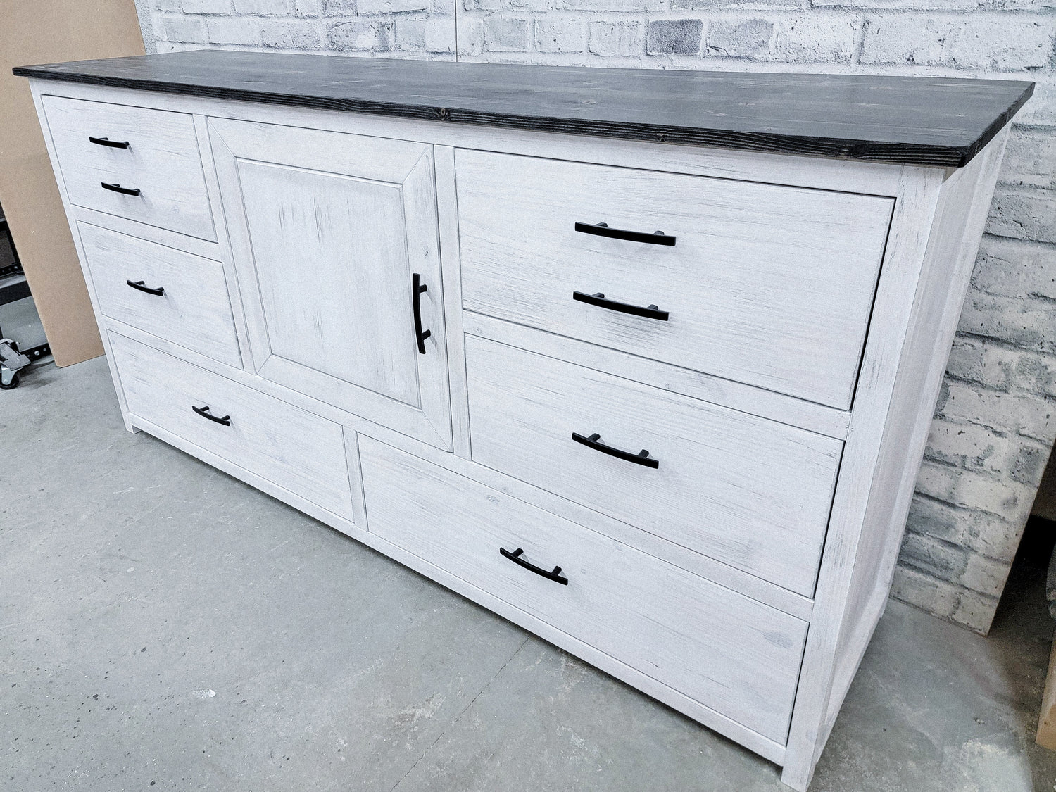 We take pride in the construction of our drawers, ensuring durability. Each drawer box is crafted from solid Eastern White Pine. The drawer bottoms are made from thicker quality plywood and are recessed into slits within the drawer box. This design ensures they remain sturdy and resist bowing or breaking over time.