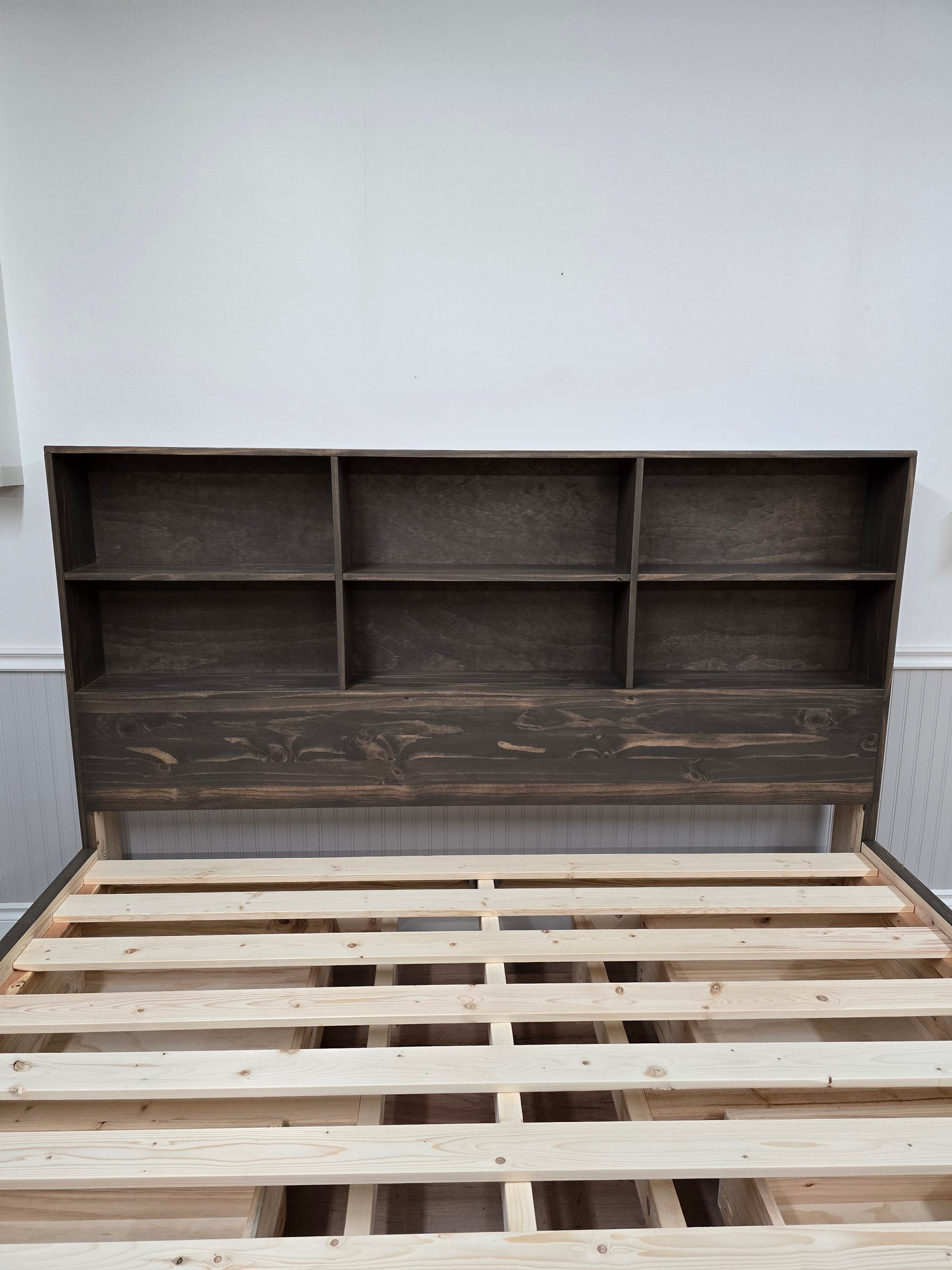 Standard headboard height is 54" and the frame is 3" wider and longer then the mattress. The standard depth for the book shelf is 8" deep. Standard sizes can be customized. May be subject to additional cost. Contact us for more information.