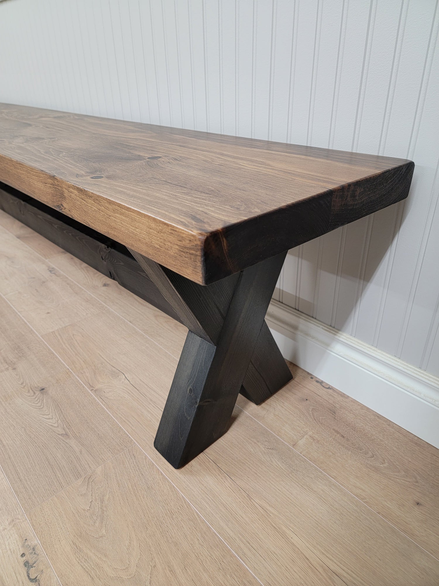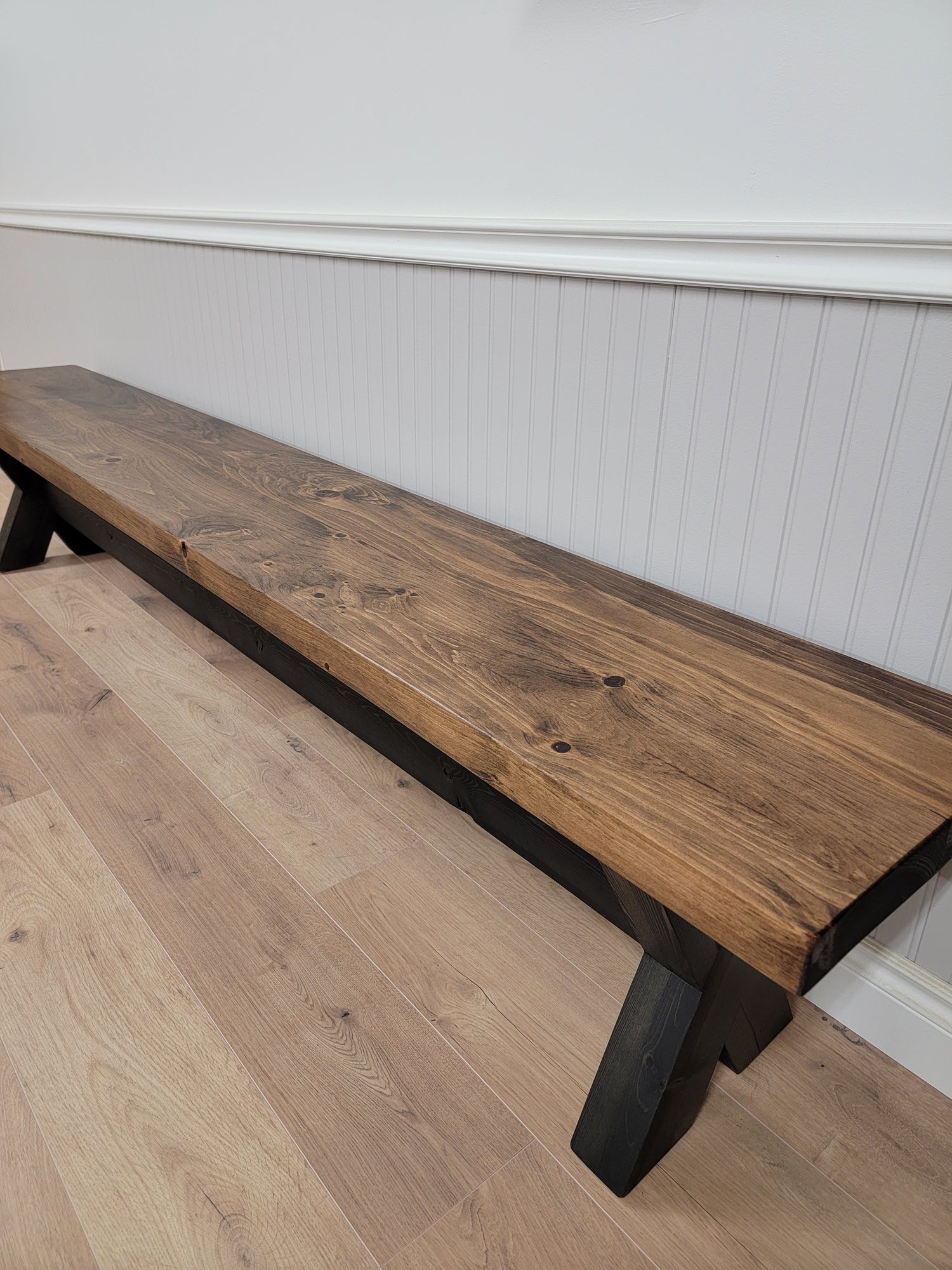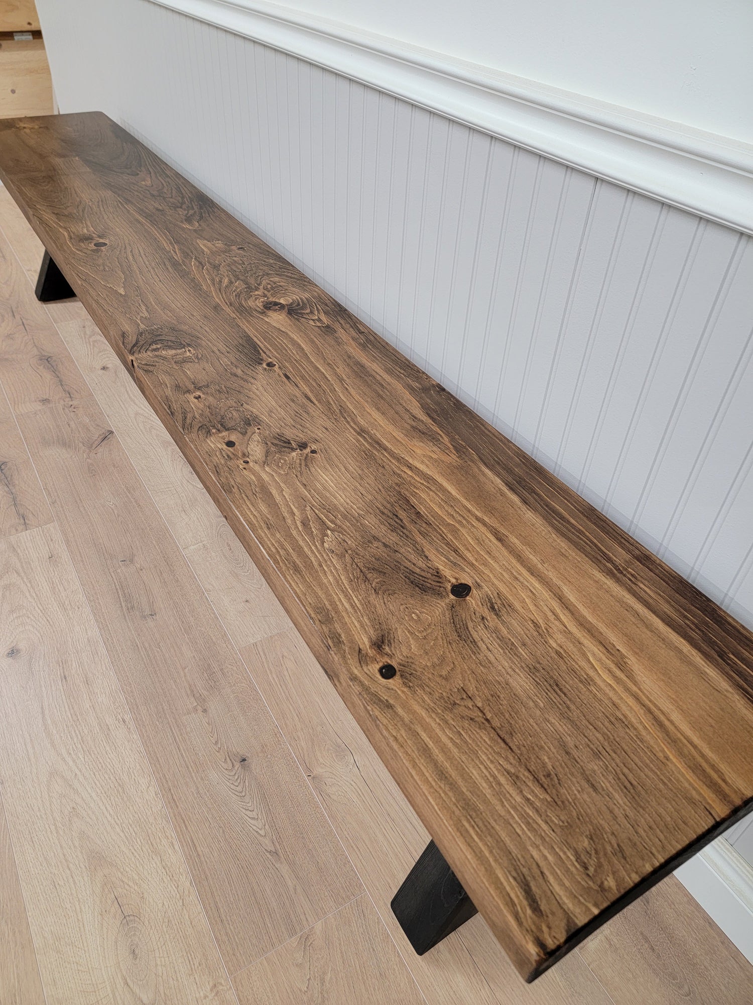 The Brampton Bench, crafted from high-quality Eastern White Pine, offers a range of customizable design options. Choose between a straight edge or a live edge to match your style, and opt for a wood base or a sleek powder-coated black metal base for a modern touch. The natural beauty of Eastern White Pine, combined with these versatile base options, ensures the Brampton Bench enhances any dining area or living space with its blend of rustic charm and contemporary elegance.