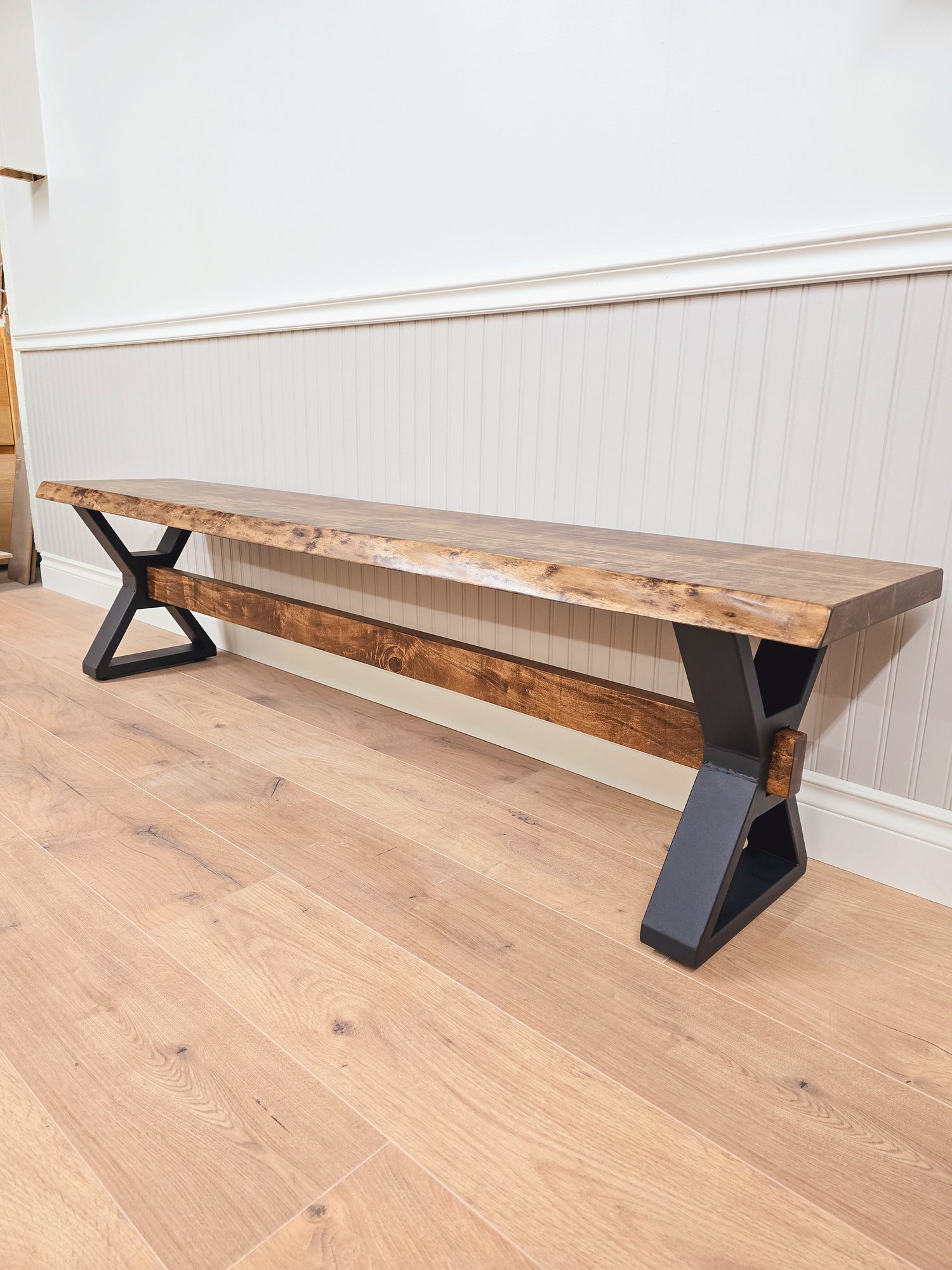 The Prairie Ambrosia Maple Bench features a striking combination of a black powder-coated metal base and a solid wood beam running down the center. The bench showcases the distinctive beauty of ambrosia maple, enhancing any space with its modern and sophisticated design. Its sturdy construction and unique elements make it a versatile addition to both contemporary and industrial interiors.