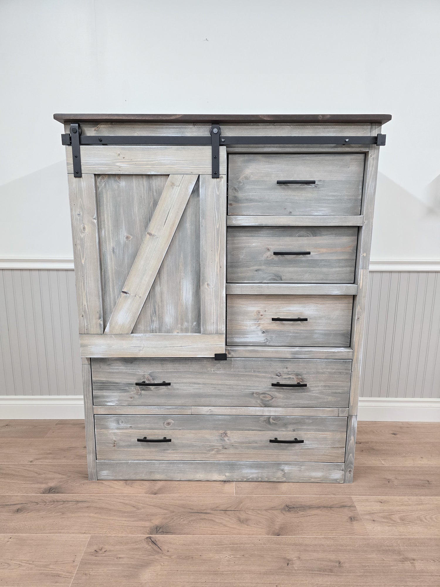 The Sliding Barn Door Dresser combines rustic charm with versatile storage options. Choose from 4 or 5 drawers, while a sliding barn door reveals additional shelving or drawers. This dresser not only provides ample storage space but also adds a unique, farmhouse-inspired touch to your decor.